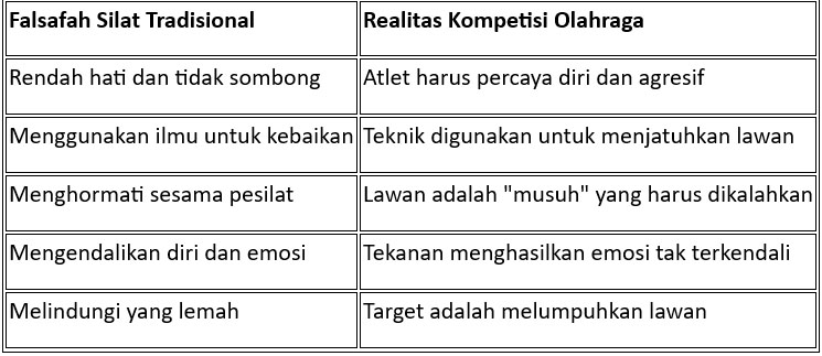 Ketika kemenangan dikejar dengan mengabaikan keselamatan lawan, ketika teknik dilakukan tanpa kontrol demi poin, maka esensi silat sebagai seni dan falsafah telah hilang. Yang tersisa hanyalah kekerasan yang dilegitimasi oleh aturan pertandingan.